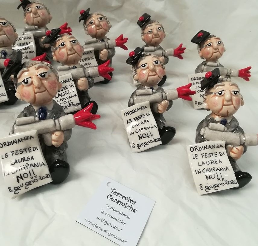 Il titolare della bottega, infatti, ha realizzato una statuetta raffigurante il presidente che, vestito di tutto punto e con tanto di ordinanza restrittiva a lato, imbraccia un lanciafiamme in azione. Un atto di spirito, realizzato per puro divertimento, che ha però incontrato l’approvazione di un laureando il quale, in previsione della discussione della tesi in programma il prossimo 8 giugno, ha pensato di chiedere al ceramista di farne delle bomboniere per il lieto evento. “Era nata come una caricatura ironica – ha commentato l’artigiano sulla pagina Facebook della propria attività – mai avrei immaginato che invece mi chiedessero di farla davvero come bomboniera. La vita è una sorpresa”. Per quanti fossero interessati, nel catalogo del laboratorio è disponibile anche una statuetta di De Luca che stringe saldamente un grosso corno rosso, rimando all’avversione espressa dal governatore per “i portaseccia”.
