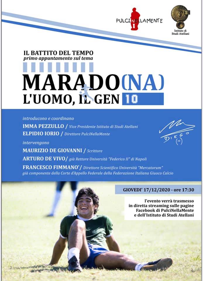 Esordio in grande stile per la rubrica Il Battito del Tempo, spazio culturale di approfondimento e riflessione ideato dall’Istituto di Studi Atellani e PulciNellaMente. Marado(na). L’uomo, il genio, è il tema del primo appuntamento in programma giovedì 17 dicembre, a partire dalle ore 17.30, che – per il rispetto delle regole anti Covid – si svolgerà in diretta streaming sulle pagine Facebook di PulciNellaMente e dell’Istituto di Studi Atellani. Di assoluto prestigio l’elenco degli ospiti. Dopo l’introduzione della vice presidente dell’Istituto di Studi Atellani, Imma Pezzullo, e del direttore di PulciNellaMente, Elpidio Iorio, che avranno anche il compito di coordinare l’incontro, sono previsti gli interventi dello scrittore Maurizio De Giovanni, del direttore scientifico dell’Università “Mercatorum”, Francesco Fimmanò, peraltro già componente della Corte d’Appello Federale della Federazione Italiana Giuoco Calcio, del già rettore dell’Università “Federico II” di Napoli, Arturo De Vivo.