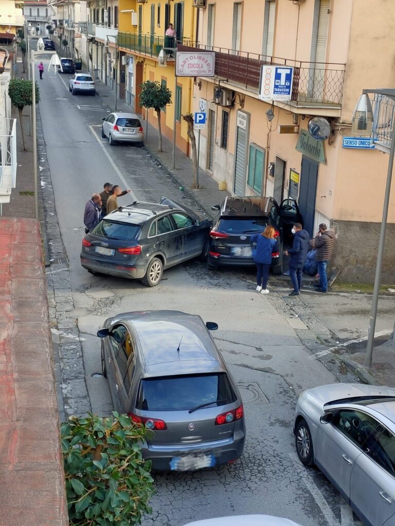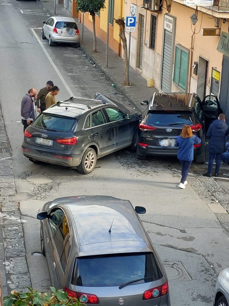 Poco fa l’ultimo scontro di una lunga serie, verso le 14.00, di fronte al Tabacchi. L’incidente ha visto coinvolte due autovetture che procedevano lungo le due vie. Una delle due auto, in seguito all’urto, è finita per schiantarsi nella porta d’entrata del tabacchi.