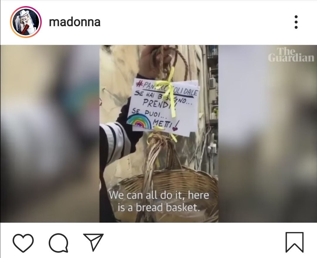 Aveva fatto il giro del web la foto del “paniere solidale” comparso tra le strade del centro storico di Napoli, solo uno dei tantissimi gesti di solidarietà che vedono i napoletani come protagonisti. Adesso il video in cui Lucariello, rapper napoletano di Scampia, mostra a tutti il concetto che c’è dietro al gesto è finito al di là dell’oceano Atlantico ed è sbarcato negli Stati Uniti. La popstar di fama internazionale Madonna (Veronica Ciccone, di origini italiane da parte del padre) ha condiviso il video sul suo profilo Instagram, social network che ormai ha raggiunto a pieno il compito di unire tutto il mondo. Incorniciato dalla didascalia “God bless you, Italy” (Dio ti benedica, Italia), il post della regina del pop mostra non solo quanto questi gesti siano importanti da fare e da condividere, ma anche il sentimento di unione ed empatia che sta attraversando tutto il mondo.
