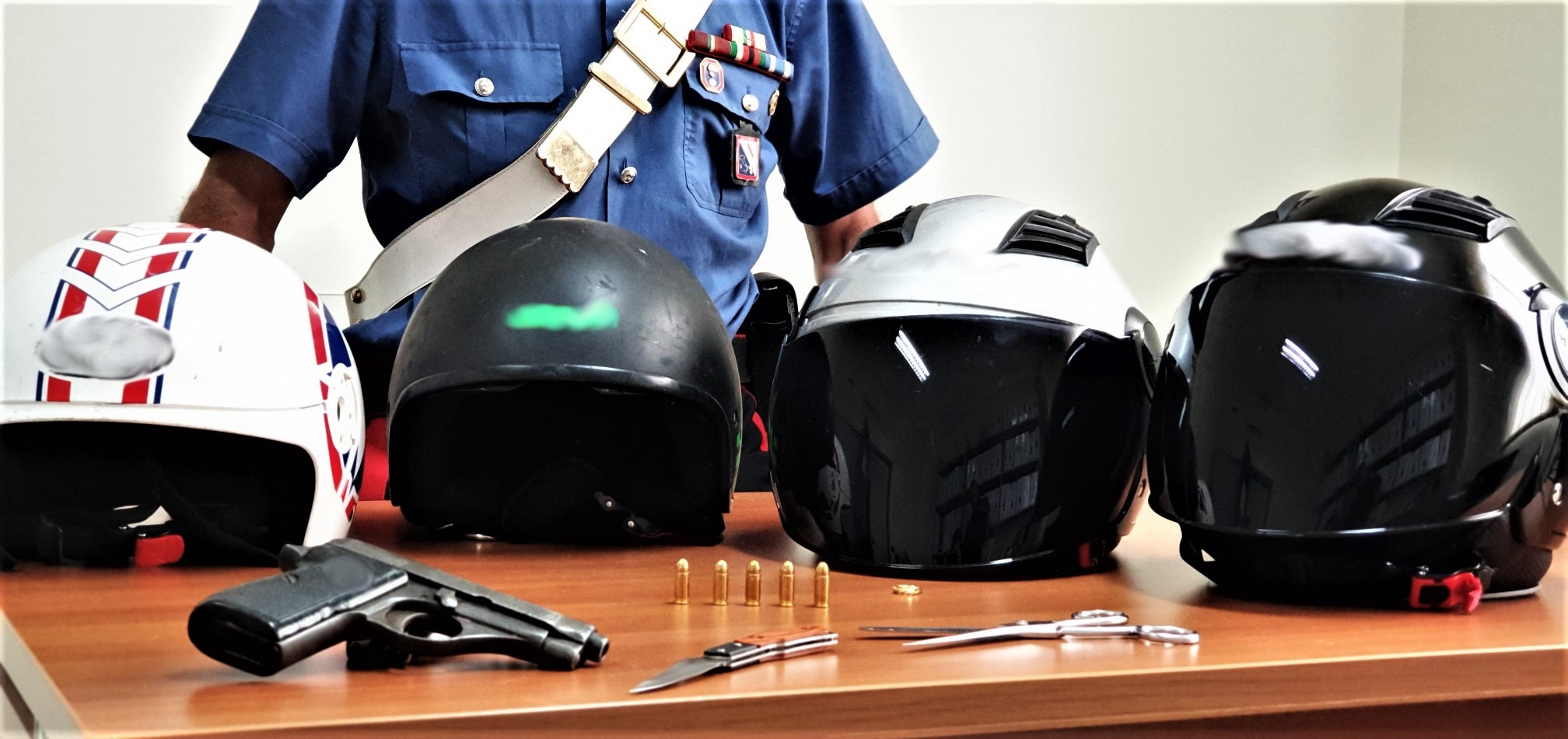 Durante la perquisizione dell’auto i carabinieri hanno trovato le conferme ai loro sospetti: sul tappetino del poggiapiedi del passeggero i militari hanno rinvenuto una pistola semiautomatica modello Beretta calibro 7,25, con matricola abrasa pronta all’uso e con cinque proiettili all’interno del caricatore. Nell’abitacolo, inoltre, sono state rinvenute un paio di grosse forbici in ferro e un coltello a serramanico dalla lama lunga quindici centimetri, entrambi nascosti nella tasca dei sedili posteriori. Nel bagagliaio, infine, la pattuglia dei carabinieri ha rinvenuto quattro caschi semi-integrali con le visiere oscurate. Tutti gli indizi raccolti facevano quindi presupporre, ai carabinieri, di trovarsi di fronte a una baby-gang di delinquenti dediti ai furti e alle rapine, anche con metodi violenti. A completare il quadro un paio di orecchini d’oro trovati a terra, tra i tappetini dell’autovettura, di dubbia provenienza, e molto probabilmente ciò che avanzava di qualche refurtiva.