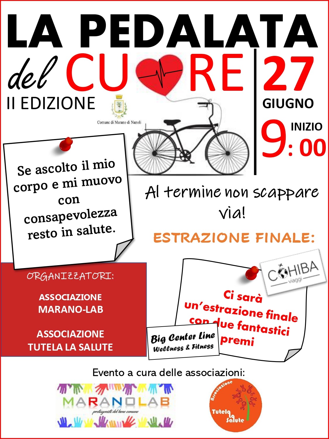 Domenica 27 giugno si terrà la seconda edizione dell’evento “La pedalata del cuore”. La manifestazione nasce con il chiaro intento di sensibilizzare le persone, incentivando l’attività fisica e promuovendo, nell’occasione, una passeggiata in bicicletta. “Se ascolto il mio corpo e mi muovo con consapevolezza, resto in salute” la citazione scelta per l’occasione. Massima che racchiude il senso di fare sport, muoversi e, perché no, creare occasioni per socializzare. Al termine della pedalata, interverrà un equipe medica, professionisti del settore, per offrire delucidazioni in merito ai presenti: Dott. ssa Maria Rosaria Rondinella, Dr. Roberto Schiavone di Favignana, Dott. ssa Francesca Della Volpe e Dr. Felice De Vita. La manifestazione è stata organizzata, in compartecipazione, dalle associazioni Tutela la Salute e Marano Lab. Si terrà in quel di Marano, ma nei prossimi mesi verrà riproposta in altri territori di Napoli.