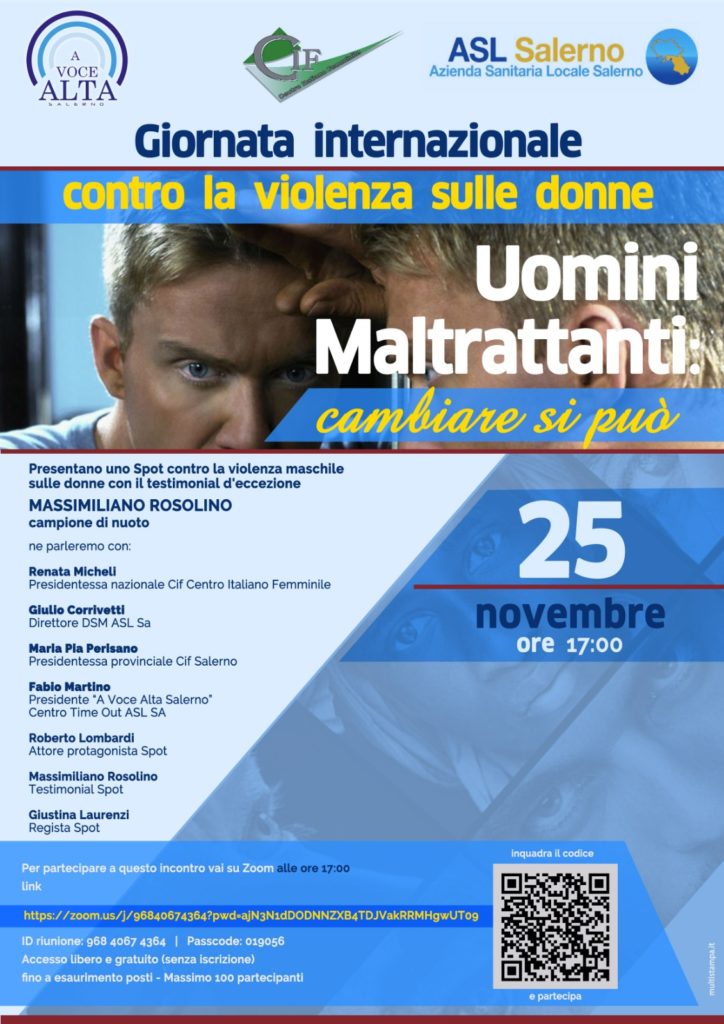 Mercoledì pomeriggio, in occasione delle celebrazioni della Giornata internazionale contro la violenza sulle donne, l’Asl di Salerno, l’associazione A voce alta e il Cif – Centro italiano femminile presenteranno uno spot contro la violenza di genere con testimonial d’eccezione il campione olimpico di nuoto Massimiliano Rosolino. Il video, che verrà presentato in anteprima sulla piattaforma virtuale Zoom, è stato realizzato grazie al contributo fondamentale della regista Giustina Laurenzi, dell’attore Roberto Lombardi e del videomaker Roberto Pisapia.