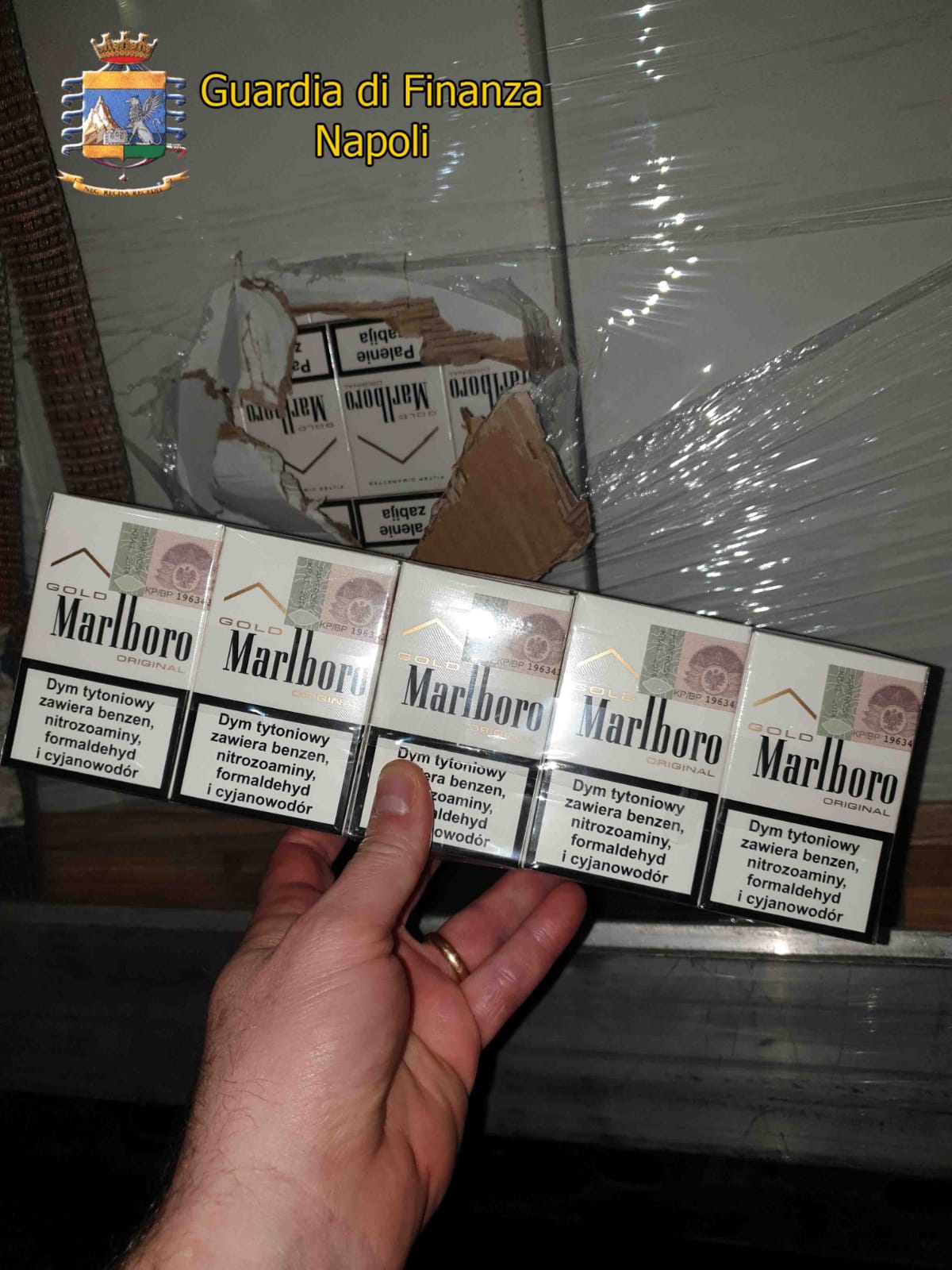 I successivi controlli operati sui mezzi di trasporto da parte delle Fiamme Gialle giuglianesi hanno permesso di riscontrare che le “bionde” erano nascoste dietro dei bancali ricolmi di “corn flakes” e avevano il marchio falso della “Marlboro Light”. I pacchetti riportavano tutti lo stesso codice alfanumerico per la tracciatura del prodotto.