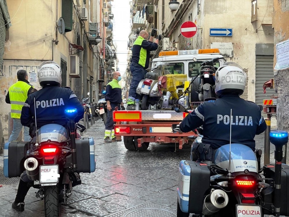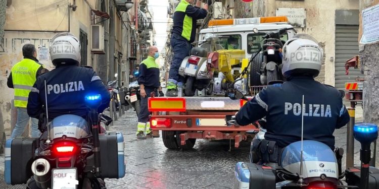 Con un intervento nella zona dei Quartieri Spagnoli, stamattina i “nibbio” dell’ufficio prevenzione generale della Questura di Napoli e gli agenti dell’ufficio veicoli abbandonati della polizia municipale partenopea hanno sequestrato 44 motoveicoli e un’autovettura parcheggiati in strada privi di copertura assicurativa. L’operazione è stata effettuata in pieno centro storico, precisamente in via Concordia, vico colonne a Cariati, via Gradini San Matteo a Toledo, vico Storto Concordia, vico Conte di Mola, vico Lungo Trinità degli Spagnoli, salita Concordia, via San Mattia, via Speranzella, vico Giardinetto e via Emanuele de Deo.