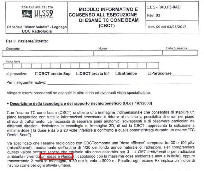 Tra Napoli e Verona, si sa, non corre certo buon sangue, almeno dal punto di vista calcistico. Per alcune ore si è rischiato l’incidente “diplomatico” anche sul versante della sanità. Ha fatto scalpore, infatti, la notizia del modulo per il consenso agli esami radiologici dell’Usll 9 di Verona in cui, per far comprendere ai cittadini quanto fosse la soglia delle radiazioni, questa veniva equiparata “alla dose assorbita vivendo un mese a Napoli (capoluogo con la massima dose ambientale annua in Italia)”.