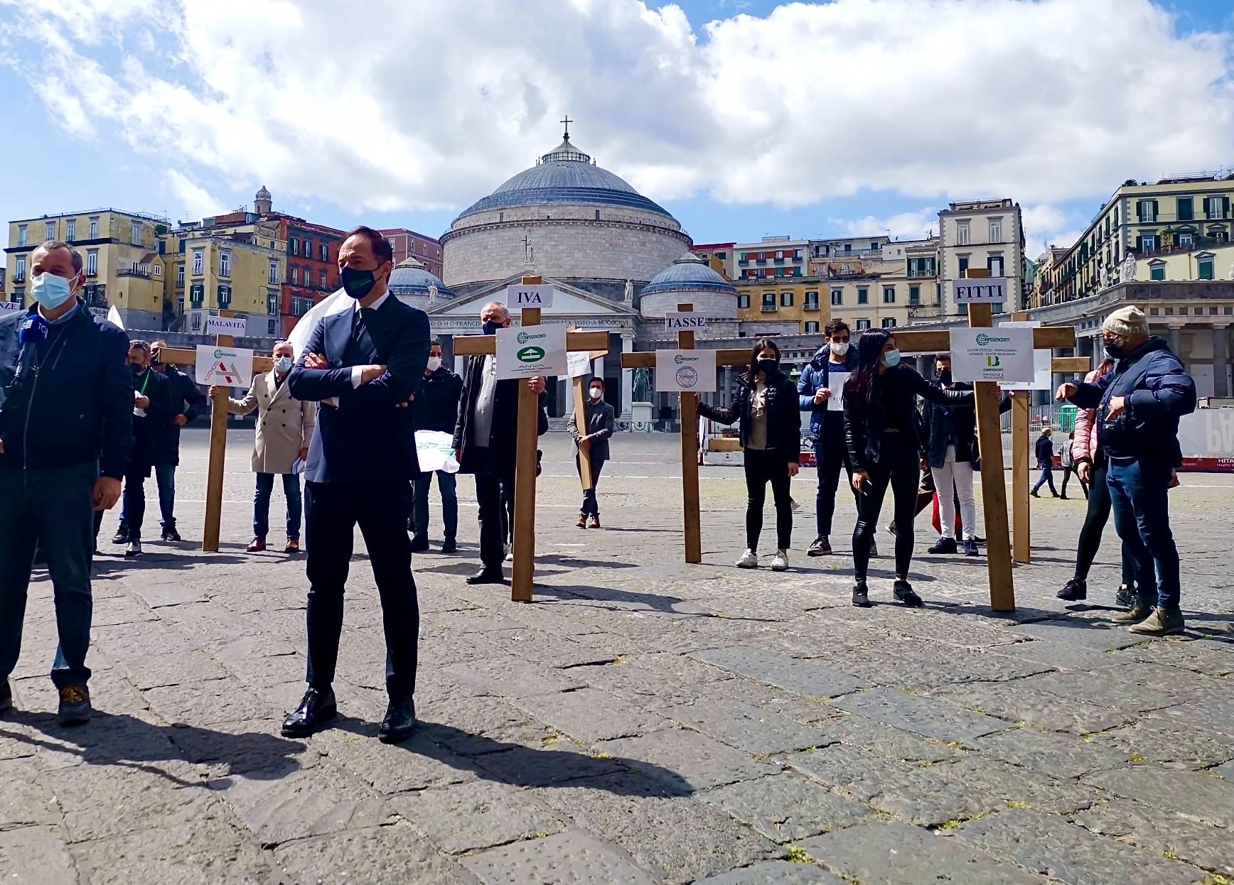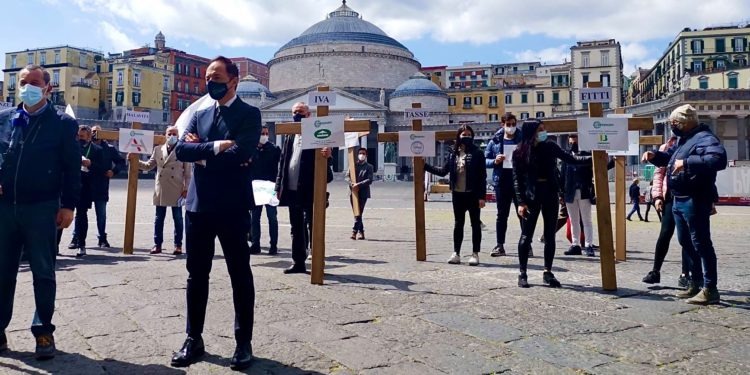 Centinaia tra commercianti, artigiani, partite Iva e professionisti sono scesi oggi in piazza a Napoli per protestare contro le misure, a loro modo di vedere inefficaci, adottate dal Governo per affrontare la crisi economica. I manifestanti si sono dati appuntamento in piazza Plebiscito portando sulle spalle in processione quindici croci di legno che simboleggiano il “calvario” che sono costretti a subire. Alla protesta pacifica hanno aderito almeno una quindicina di categorie lavorative: in piazza c’erano infatti esercenti pubblici, parrucchieri, estetiste, ambulanti, lavoratori nei settori della moda e del turismo, gestori di case vacanze e di bed & breakfast e tanti altri piccoli commercianti e artigiani, tutti accomunati da serie difficoltà ad arrivare a fine mese. Nel mirino ci sono infatti le poche risorse messe a disposizione finora dal Governo Draghi per affrontare le chiusure disposte per limitare la diffusione del Covid-19 durante la terza fase dell’epidemia.
