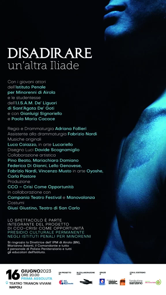 L’opera inedita “Disadirare: un’altra Iliade” scritta e diretta da Adriana Follieri, e presentata da CCO (Crisi Come opportunità), associazione impegnata dal 2006 in progetti di inclusione sociale attraverso l’utilizzo dell’arte in tutte le sue forme all’interno degli Istituti Penali per Minorenni. Le musiche originali sono scritte dal rapper e formatore Luca Caiazzo, in arte Lucariello, i costumi donati dal Teatro San Carlo di Napoli.