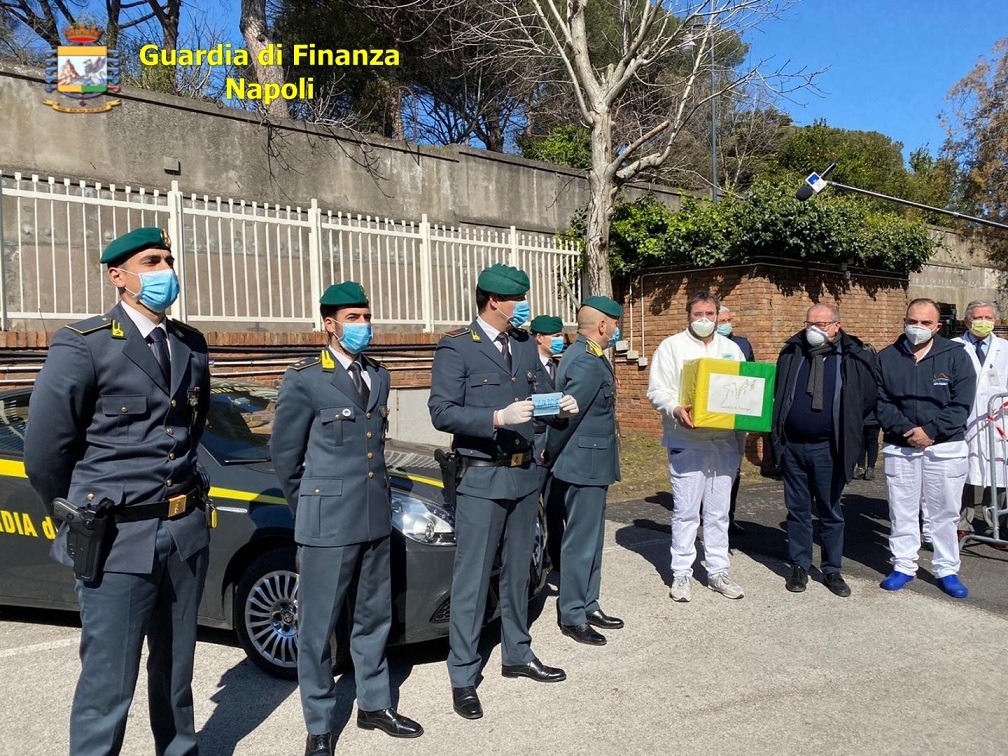 Il comando provinciale della Guardia di finanza di Napoli ha devoluto oltre mille mascherine di protezione all’ospedale Cotugno di Napoli per fronteggiare in maniera efficace l’emergenza sanitaria causata dall’epidemia da Covid-19. I presidi sanitari sono stati consegnati dalle Fiamme gialle al medico Giuseppe Fiorentino, direttore dell’unità operativa complessa di fisiopatologia e riabilitazione respiratoria nonché responsabile della terapia sub-intensiva attiva presso l’Azienda ospedaliera dei colli Monaldi-Cotugno.