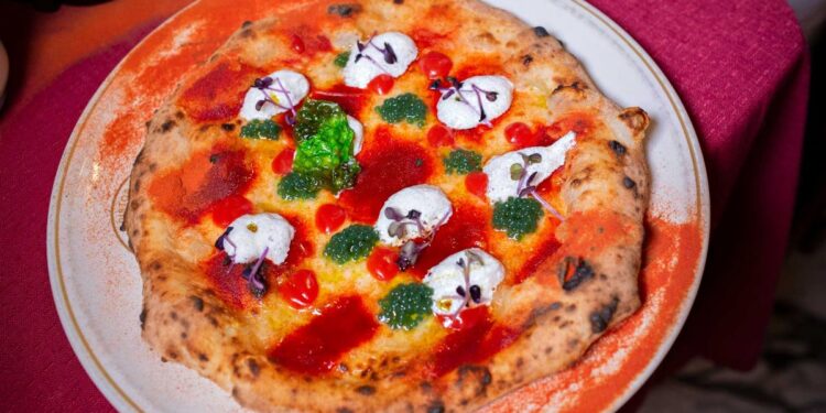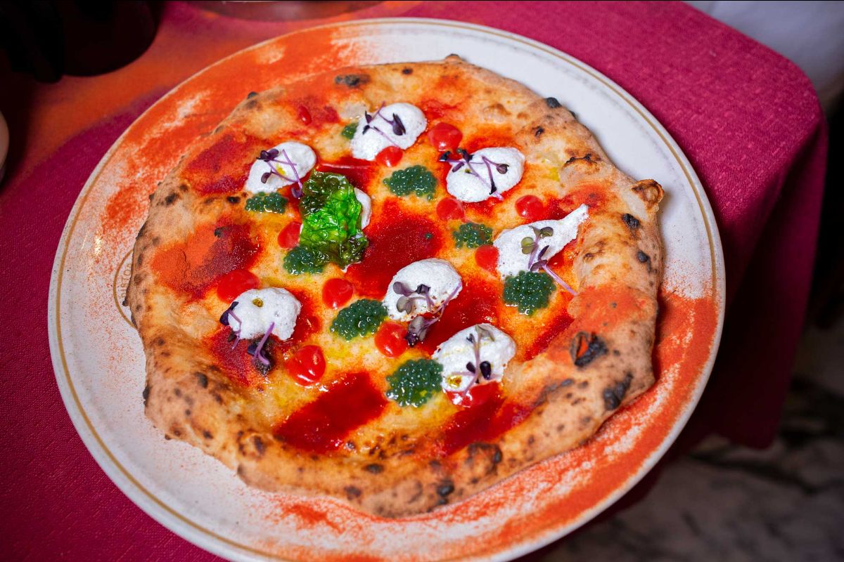 L’impasto è un blend di farine con una percentuale prevalente di farina semintegrale, ricca di micronutrienti, vitamine e minerali, a cui è stato aggiunto glucomannano purificato, fibra naturale dimagrante, capace di ridurre l’assorbimento intestinale di zuccheri e grassi ingeriti in concomitanza. Si parte da un panetto di 180g, a fronte dei generici da 250g, con una notevole riduzione di carboidrati, la cui farcitura prevede l’impiego di varie consistenze di pomodoro, grappoli di basilico, e piante officinali fritte a basse temperature (130 gradi) per conservare al meglio i profumi e gli olii essenziali, oltre a batuffoli di spuma di latte scremato con aggiunta di probiotici. A garantire la giusta sapidità non il sale, ma l’acido ascorbico del caviale di basilico. Una base di fior di latte, nelle giuste quantità, per ottenere una cottura più uniforme e quindi una maggiore digeribilità. A condire la pizza l’olio extra vergine di oliva di alta qualità. La pizza EVA sarà servita su piatti artigianali di Vietri prodotti in esclusiva per l’evento, e depositata come ricetta originale sulla piattaforma di registrazione ricette Mysocialrecipe.com.