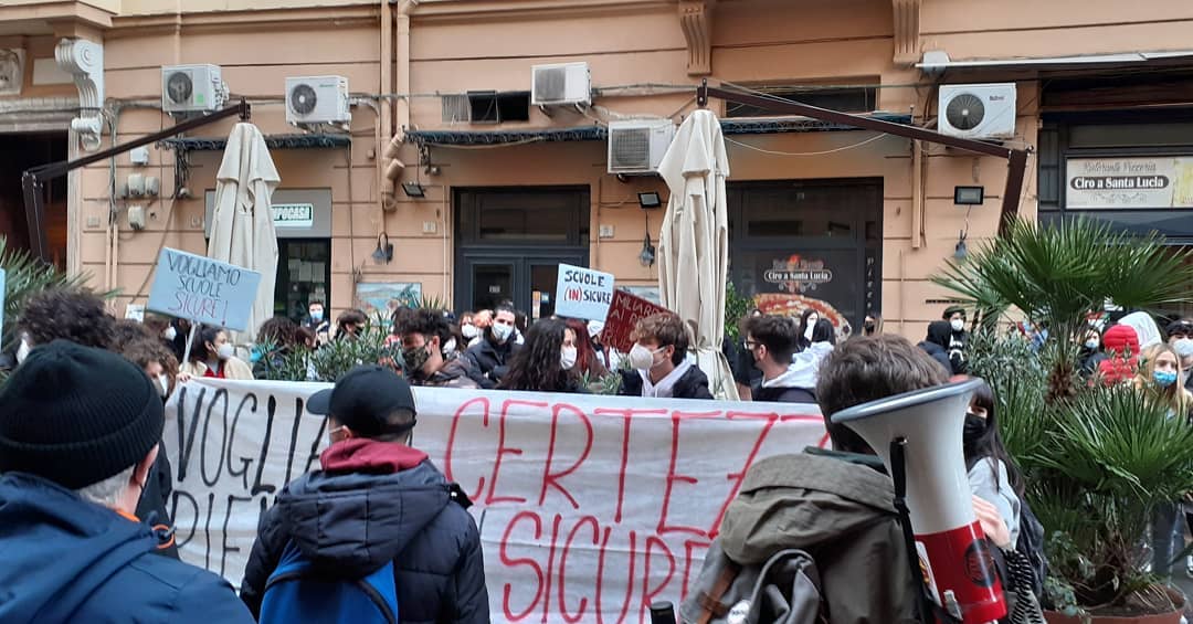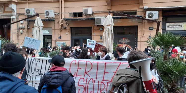 Si sono ritrovati a Napoli, davanti a palazzo Santa Lucia, sede della Regione Campania, per chiedere certezze e un rientro a scuola in sicurezza. Questa l’iniziativa di un gruppo di studenti provenienti da diversi centri della Città metropolitana di Napoli, che con un presidio statico hanno cercato di dare voce alle loro rimostranze e richieste di maggiore organizzazione per la ripresa delle lezioni in presenza. I manifestanti chiedono, in sostanza, di poter rientrare nei rispettivi istituti dopo quasi un anno di didattica a distanza, ma di poterlo fare in condizioni di sicurezza per prevenire una proliferazione del contagio da Covid-19 nelle aule.