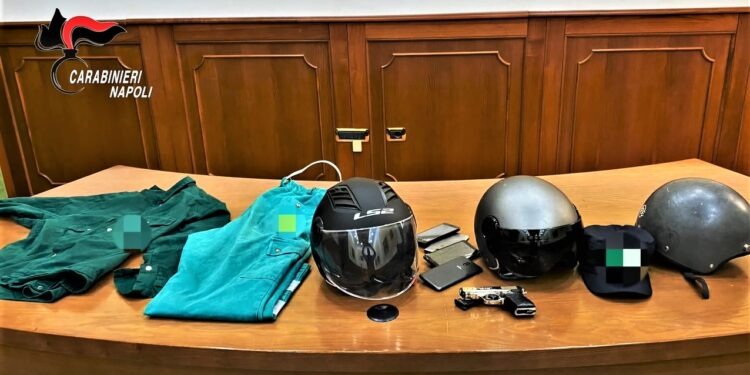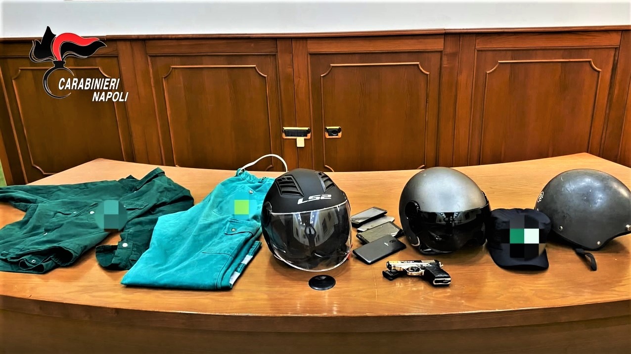 I due sospettati indossavano altresì le classiche divise da lavoro usate dai dipendenti della nettezza urbana, complete di bande catarifrangenti e cappellino, in maniera tale da camuffarsi senza destare alcun sospetto da parte delle vittime e dei passanti. I carabinieri li hanno così seguiti fino alla salita Pontecorvo, nel quartiere Avvocata: qui si sono interposti allo scooter intimando l’alt. L’uomo che era alla guida del motociclo è riuscito a fuggire a piedi facendo perdere le sue tracce tra gli intricati vicoli del centro storico mentre il passeggero, A. B., volto già noto alle forze dell’ordine, è stato bloccato e ammanettato. Durante le perquisizioni il reo è stato trovato in possesso di una pistola argentata la cui impugnatura era avvolta nel nastro isolante per migliorarne la presa e di una somma in denaro contante pari a trecento euro.