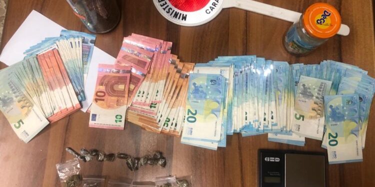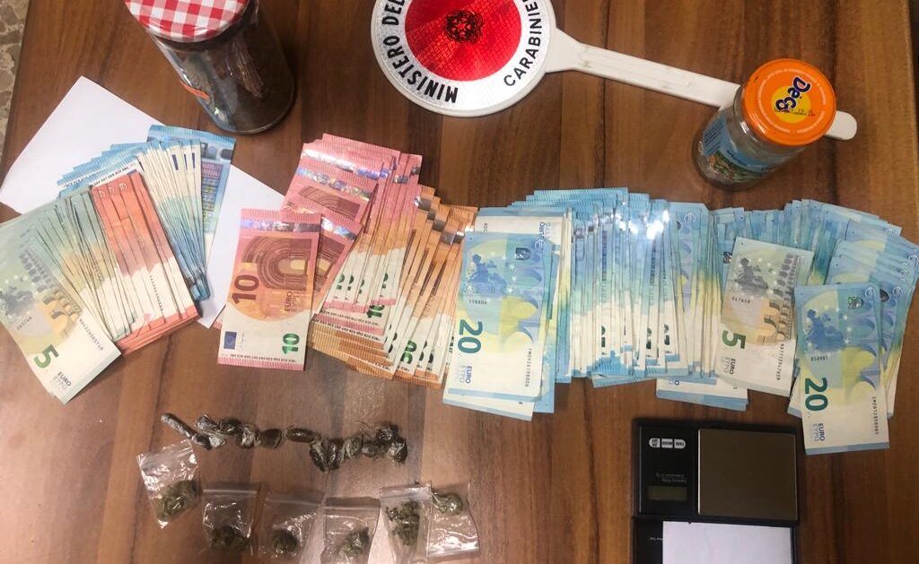 I militari, quindi, nel corso del servizio, hanno arrestato tratto in arresto, in flagranza del reato di spaccio e detenzione ai fini di spaccio di sostanza stupefacente, un 24enne del luogo. Il giovane è stato sorpreso mentre cedeva, ad un 20enne del luogo, nr. 3 involucri in cellophane contenente 2,7 gr di hashish al prezzo di 30 euro. La perquisizione personale eseguita sul posto a carico del pusher ha consentito di rinvenire, occultate negli indumenti, ulteriori 4 dosi di sostanza stupefacente del tipo marijuana del peso lordo complessivo di 3,4 gr. e n. 5 dosi di sostanza stupefacente del tipo hashish del peso lordo complessivo di 4,5 gr.