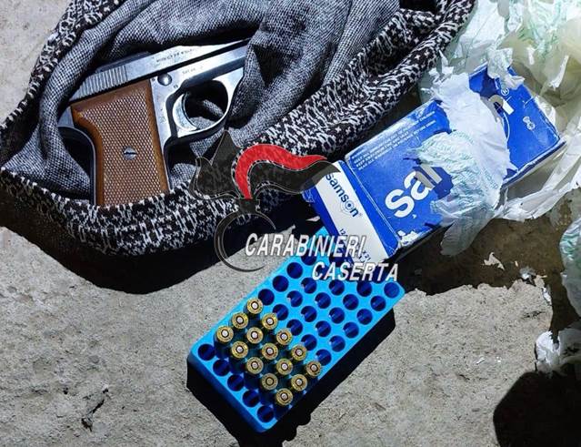 L’episodio è accaduto nel pomeriggio di ieri presso una privata abitazione a Macerata Campania: rinvenute e sequestrate, una pistola, 15 proiettili calibro 9x21 e 12 proiettili calibro 7,65