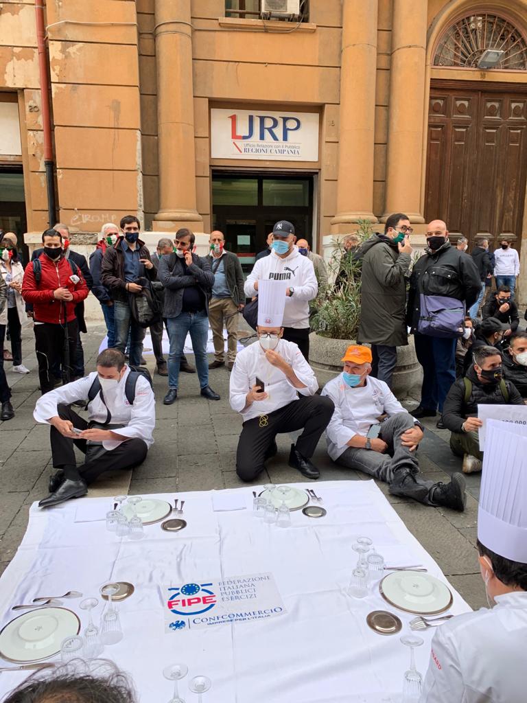 La protesta certamente più scenografica di tutte è stata messa in campo – in contemporanea con altre diciotto piazze italiane – da Confcommercio e Fipe (la Federazione Italiana Pubblici Esercizi), che gridando lo slogan “Il piatto piange” hanno trasformato via Santa Lucia davanti alla Regione in una mega-tavola imbandita, apparecchiando tavoli immaginari direttamente sui marciapiedi. In questo modo, dunque, i titolari di bar, ristoranti, locali, imprese di catering hanno voluto evidenziare le condizioni di sofferenza e affanno in cui versa un’intera categoria. Alla manifestazione sono intervenuti anche i ristoratori casertani, con una delegazione guidata dal presidente provinciale di Confcommercio, Lucio Sindaco, e dal presidente provinciale Fipe, Giuseppe Russo.