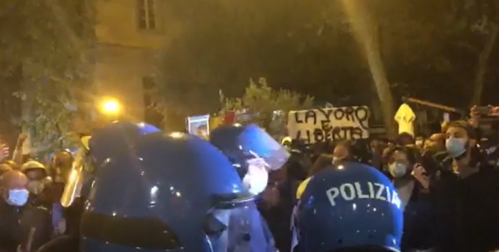 Il corteo, infatti, aveva attraversato il centro di Napoli intonando cori contro De Luca, ma anche contro il presidente del Consiglio dei ministri, Giuseppe Conte, con slogan come “Tu ci chiudi, tu ci paghi“. La tensione era salita man mano che il corteo s’avvicinava alla sede della Regione in via Santa Lucia, dove a norma di legge sono intervenute le forze dell’ordine per disperdere i manifestanti, poiché il loro raduno violava l’ordinanza regionale numero 83. A Santa Lucia si erano viste vere e proprie scene di guerriglia urbana, con le forze dell’ordine schierate in assetto antisommossa e un lancio di sassi, bombe carta e fumogeni verso di loro. Una camionetta dei carabinieri era stata centrata in pieno, mentre per provare a disperdere una folla sempre più numerosa era iniziato un fitto lancio di lacrimogeni da parte delle forze dell’ordine. Cassonetti dei rifiuti erano stati rovesciati e dati alle fiamme, mentre alcuni manifestanti si erano prodotti in un’autentica caccia al poliziotto, mazze e bastoni alla mano.