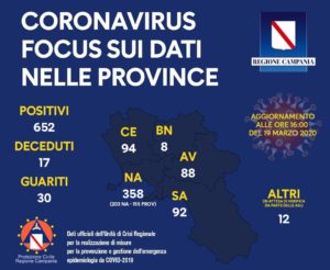 Questo il riparto per provincia: Napoli 358 (di cui: 203 Napoli città, 155 Napoli provincia); provincia di Caserta 94; provincia di Salerno 92; provincia di Avellino 88, provincia di Benevento 8. Altri in fase di verifica 12, deceduti 17, guariti: 30 (di cui 3 totalmente guariti e 27 guariti “clinicamente” cioè divenuti asintomatici per risoluzione della sintomatologia clinica presentata).