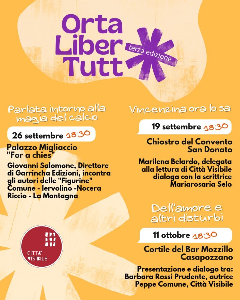 Si svolgerà dal 19 settembre all’11 ottobre 2024 la nuova edizione di Orta Liber* Tutt*, rassegna culturale e letteraria atellana che per il terzo anno consecutivo, dopo il successo delle passate edizioni, avrà luogo nella città di Orta di Atella, in provincia di Caserta.