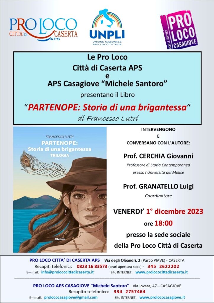 Venerdì primo dicembre, alle ore 18:00, presso la sede della Pro Loco Città di Caserta, situata nel Parco Piave, in Via degli Oleandri 2 a Caserta, si terrà la presentazione del libro Partenope: Storia di una brigantessa, romanzod’avventura a sfondo storico scritto dal giovane autore casertano Francesco Lutri e pubblicato dalla casa editrice Albatros – Il Filo. L’interessante evento culturale è organizzato dall’associazione di promozione sociale del capoluogo casertano in collaborazione con laPro Loco Michele Santoro di Casagiove. All’iniziativa, nata con l’intento di promuovere e valorizzare i giovani scrittori emergenti di Terra di Lavoro, prenderanno parte, oltre all’autore, lo scrittore casertano il prof. Luigi Granatello, già presidente della Pro Loco di Casagiove, e l’insigne storico e accademico casertano il prof. Giovanni Cerchia, docente di Storia Contemporanea presso l’Università degli Studi del Molise.