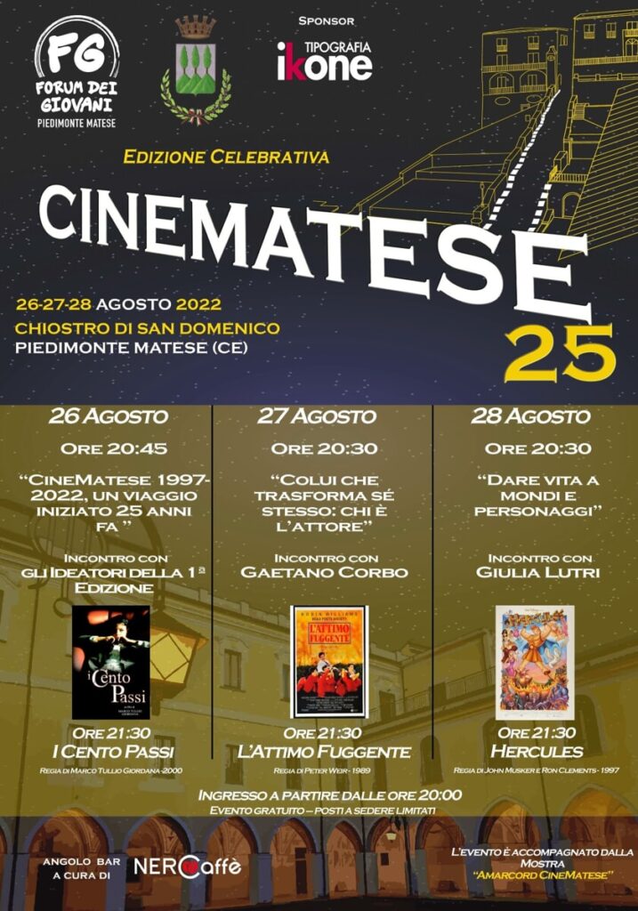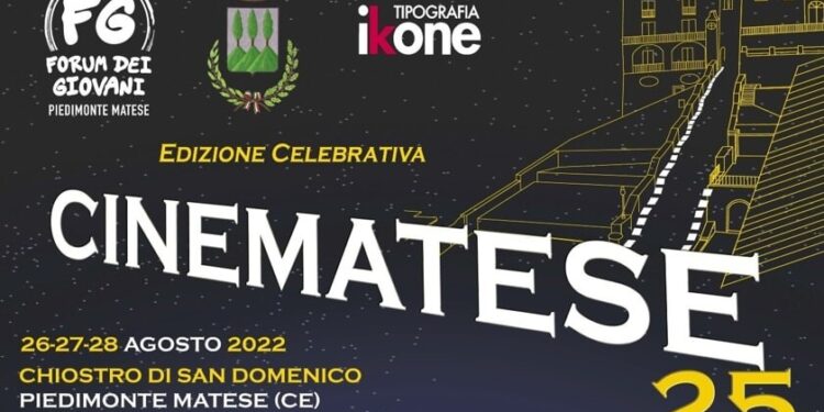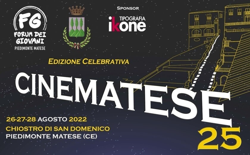 A Piedimonte Matese, in provincia di Caserta, torna il cinema all’aperto il “CineMatese 25” per raccontare di come è cambiato il mondo della pellicola. Il Forum dei Giovani di Piedimonte Matese, con il patrocinio del Comune di Piedimonte Matese ripropone il modello delle serate in piazza davanti al grande schermo a 25 anni dalla sua prima edizione. Tre le serate celebrative 26, 27 e 28 agosto 2022, tre le proiezioni organizzate all’interno del chiostro di San Domenico, nel complesso museale di San Tommaso d’Aquino con tanti ospiti del mondo del cinema, che saranno i padrini e le madrine delle serate e la presenza in primis degli organizzatori delle prime edizioni del CineMatese, che racconteranno degli imprevisti, delle loro esperienze, delle tante paure ma soprattutto delle speranze legate a questa encomiabile iniziativa.
