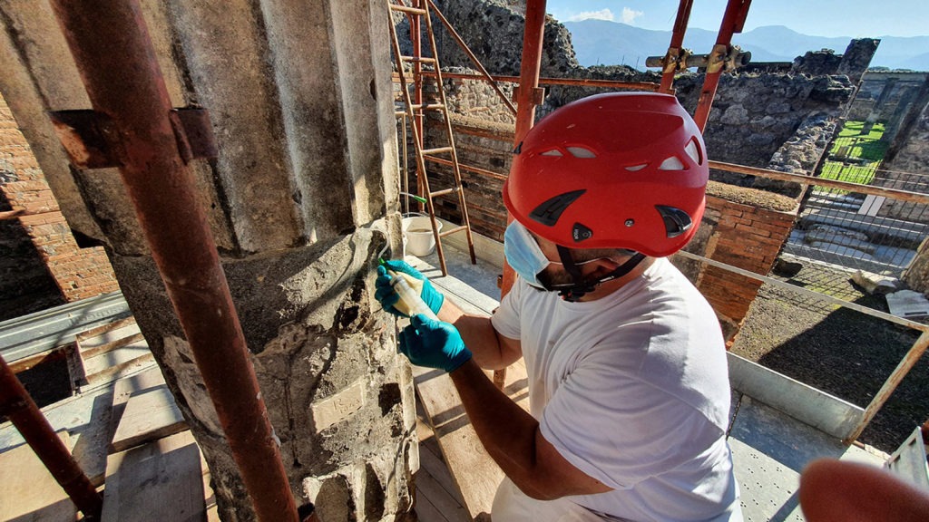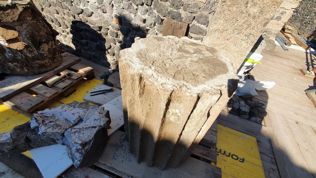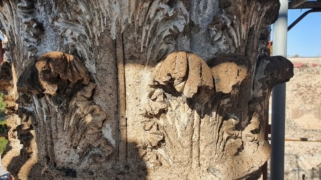 Lo stato in cui versavano le colonne ha dunque richiesto un intervento complesso, al fine di intervenire, una volta per tutte, in maniera integrale. Nello specifico, i lavoratori hanno smontato e movimentato, da cima a terra, attraverso argano, i singoli componenti di due delle colonne che presentavano i problemi più gravi di stabilità e in stato fortemente frammentario (quella puntellata e quella esposta a sud). Successivamente si è proceduto “a terra” dei blocchi: sono stati rimossi tutti gli elementi non più idonei e che, col passare del tempo, avrebbero causato solo ulteriori danni (si tratta di elementi metallici, stuccature cementizie e malte di restauro), sostituendo il tutto con nuovi materiali più stabili e duraturi. Una volta terminata questa fase, le colonne sono state ricollocate nel loro alloggiamento originario, seguendo il rilievo tracciato in precedenza. Su tutte le colonne sono state effettuate operazioni di pulitura, trattamento biocida, stuccatura, consolidamento e protezione per salvaguardare i materiali originali in pietra, stucco e intonaco, già consumati da vento e pioggia.