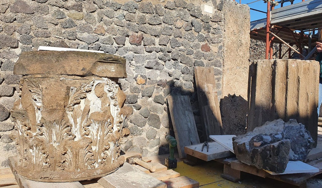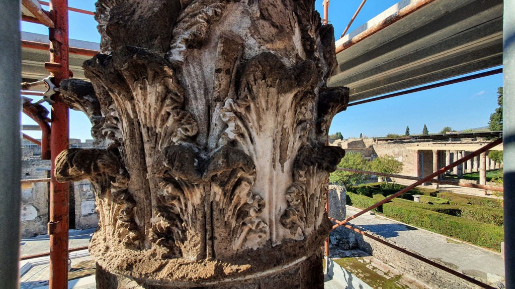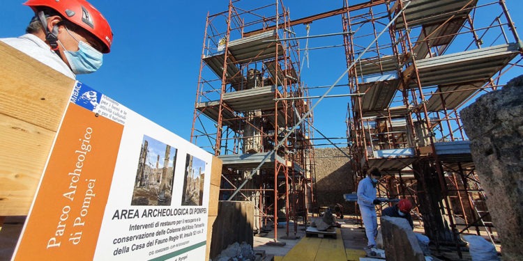 Continua a regalare emozioni il Parco archeologico di Pompei. Dopo anni di travagliate vicende, tra bombardamenti e terremoto, ritornano finalmente integre le colonne dell’atrio secondario della casa del Fauno, al termine di un complesso intervento di restauro. La casa del Fauno è, a tutti gli effetti, una delle più sontuose dimore pompeiane: si estende su un intero isolato per circa tremila metri quadrati e, come molti degli edifici del Parco archeologico, fu colpita dai bombardamenti della Seconda guerra mondiale. Le due bombe precipitate nel settembre del 1943 ebbero effetti devastanti colpendo l’abitazione e, nello specifico, l’atrio tetrastilo a quattro colonne, il quale costituiva il punto d’accesso alla zona privata della casa. Gli ordigni avevano raso al suolo tre colonne corinzie in tufo e decorate in stucco, mentre rimaneva integra solo quella esposta a nord.