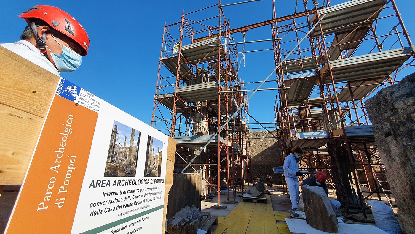 Solo nel 1946 le colonne furono ricostruite con i metodi e i mezzi dell’epoca, utilizzando diverse aggrappature in ferro o in lamine zincate e malte cementizie, rivelatesi, successivamente, poco idonee per la conservazione. Il terremoto giunto meno di quarant’anni dopo, nel 1980, ha ulteriormente messo in pericolo lo stato delle colonne, nuovamente ricostruite, ma con azioni che hanno innescato processi di fratturazione e frammentazione importanti. Prima dell’ultima operazione di restauro, le colonne del Fauno si presentavano in condizioni molto precarie: erano puntellate con tubi, giunti metallici e palanche in legno che servivano a sostenere e conservare tutte le parti frammentate, parzialmente sollevate o completamente staccate, oltre ad altri elementi di degrado in stato avanzato.