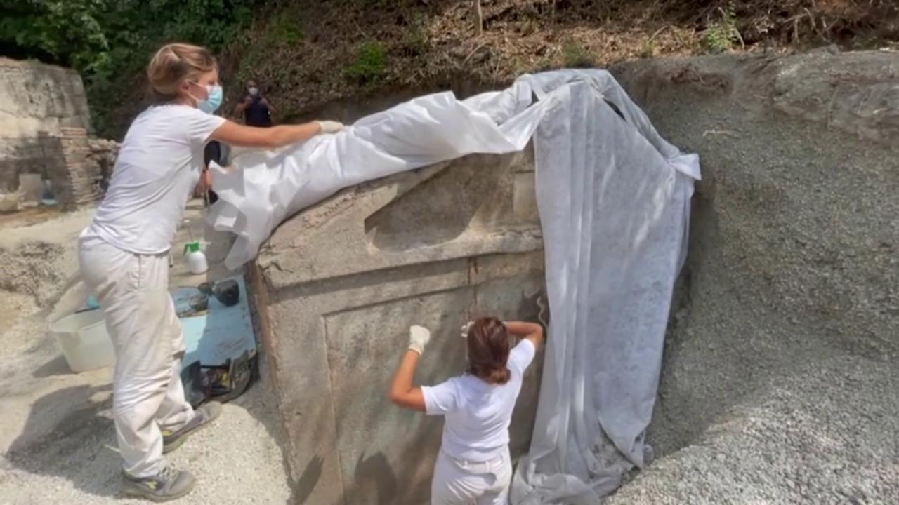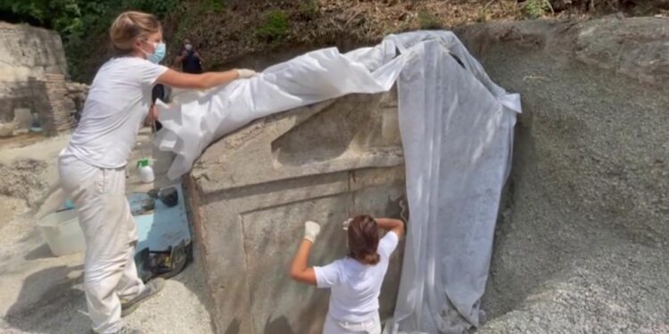 “Pompei non smette di stupire” emblematica la dichiarazione del Ministro della Cultura, Dario Franceschini. Viene così accolta la notizia del ritrovamento di una tomba mastodontica rinvenuta negli scavi archeologici di Pompei. L’edificio tombale ha una struttura particolarissima, a recinto, con una facciata decorata da piante verdi su fondo blu e una camera per l’inumazione. Il ritrovamento è avvenuto all’esterno della necropoli di Porta Sarno, uno degli importanti varchi di accesso alla città, a est dell’antico centro urbano di Pompei.