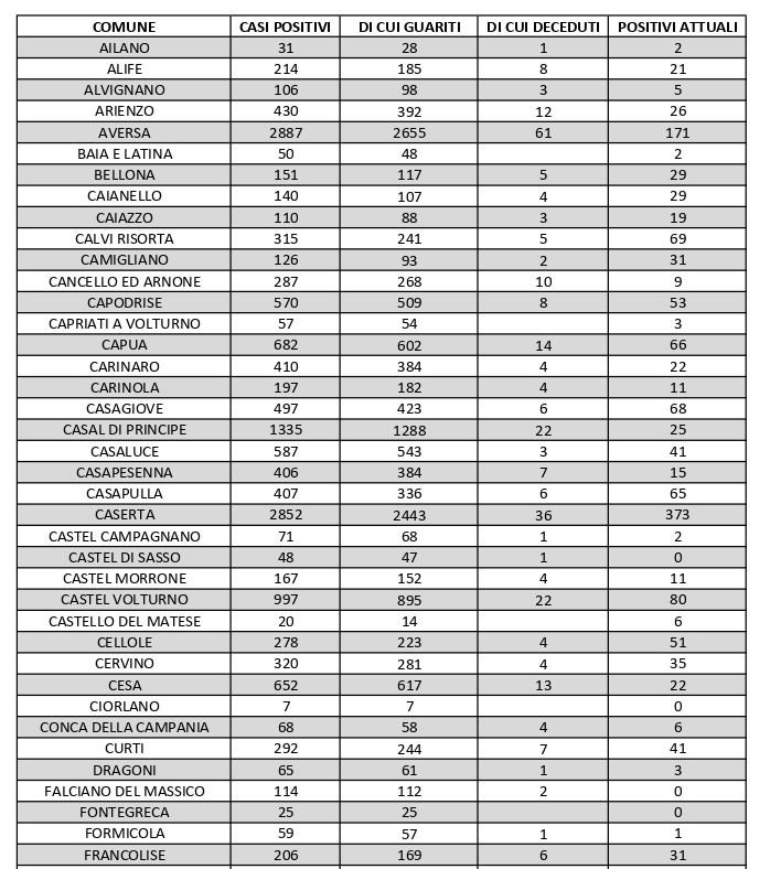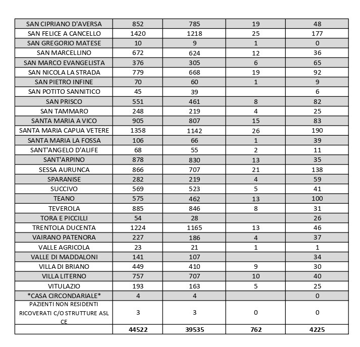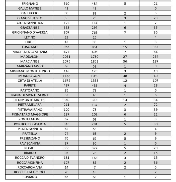 Per quanto riguarda i numeri dell’intera provincia, il bollettino quotidiano diffuso dalla Asl di Caserta e aggiornato alle 12 evidenzia che su 2.002 tamponi giornalieri ne sono risultati positivi 291 e ci sono state 111 guarigioni. Nelle scorse ventiquattr’ore, purtroppo, in tutta la provincia è stato registrato un nuovo decesso causato dall’infezione da Covid-19 e dalle sue conseguenze. Il numero complessivo delle morti per Coronavirus in Terra di lavoro dall’inizio della pandemia, dunque, sale da 761 a 762. Nel bollettino odierno, scende il numero di contagi attivi nella città di Caserta, che ne conta attualmente 373. La città col maggiore numero di casi di positività della provincia rimane comunque proprio il capoluogo, seguita da Maddaloni con 254 contagi, Santa Maria Capua Vetere con 190, Marcianise con 187 e San Felice a Cancello con 177 casi.