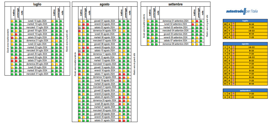 Come già anticipato, gli spostamenti più consistenti sono attesi a partire dalla giornata di domani, sabato 27 luglio, in uscita dai grandi centri urbani verso le principali direttrici che da nord portano alle località di villeggiatura del sud, lungo l’A1 Milano-Napoli, l’A14 Bologna-Taranto e l’A30 Caserta-Salerno. I giorni segnati dai maggiori volumi di traffico saranno quelli di sabato 3 e sabato 10 agosto. Il traffico sarà ancora intenso verso le località turistiche anche nel fine settimana che seguirà il Ferragosto, mentre i rientri nelle grandi città saranno invece più diluiti e riguarderanno soprattutto gli ultimi tre fine settimana di agosto.