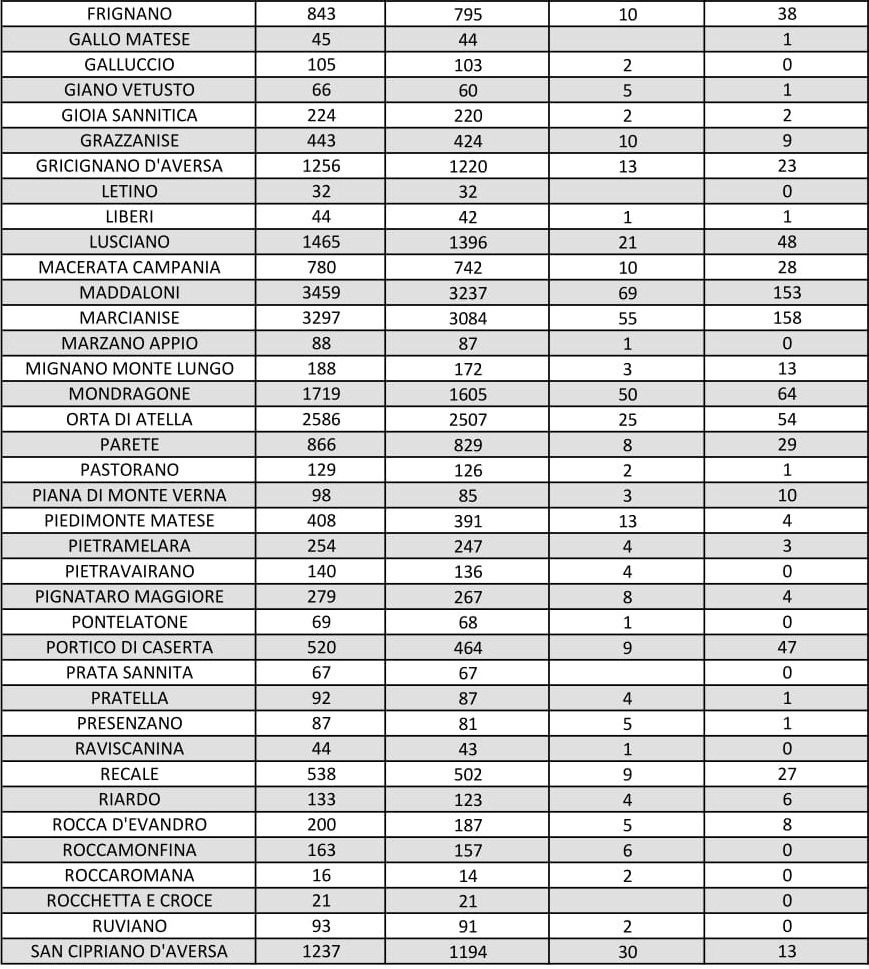 I dati di Aversa vanno letti tenendo conto anche dei casi nei Comuni dell’intero Agro aversano, area densamente popolata con i centri abitati che sono confinanti tra di loro. Questi i dati riferiti alle singole realtà territoriali: le persone attualmente positive sono 7 a Carinaro, 15 a Casaluce, 8 a Cesa, 23 a Gricignano d’Aversa, 48 a Lusciano, 29 a Parete e 14 a Teverola. Negli altri centri la situazione è la seguente: Casal di Principe conta 22 contagi, Casapesenna 12, Frignano 38, San Cipriano d’Aversa 13, San Marcellino 45, Sant’Arpino 22, Trentola Ducenta 49, Succivo 11, Villa di Briano 32 e Villa Literno 16.
