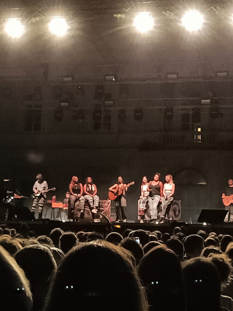 La scaletta della serata ha spaziato tra vecchi e nuovi successi. I brani di apertura sono quelli dell’ultimo album, seguiti dai grandi classici in lingua inglese come Rainbow, Heaven Out of Hell, Together, No Hero e quelli che rivalutano l’uso della lingua madre come Eppure sentire (un senso di te), Gli ostacoli del cuore, Anche fragile. Ovviamente non sono mancati i due successi sanremesi, Luce (tramonti a nord est) (2001) e il recentissimo O forse sei tu (2022). Ma probabilmente il vero inno di questo tour è I Feel It In The Earth, il cui testo è strettamente legato al messaggio principale che l’artista intende veicolare.