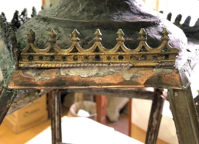 Il manufatto dell’Ottocento sarà sottoposto ad una serie di prove di pulitura, che torneranno a far risplendere la pregiata decorazione a cesello, in ottone, nascosta dai secoli e da numerosi strati di vernice verde. L’intelaiatura della lanterna ha una struttura esagonale ed è costituita da rame e ferro, a sua volta trattata con vari tipi di vernici nel corso dei decenni. La superficie della lanterna, per forza di cose, è interessata da un avanzato processo di corrosione, che sta portando ad un graduale indebolimento di tutto il manufatto. Per rallentare il deterioramento chimico e antropico (cioè l’alterazione dello stato di conservazione di un bene a causa della collocazione impropria di elementi tecnologici), le fatture originali verranno trattate con un composto protettivo. A subire un intervento di sostituzione o di restauro anche i vetri e il braccio portante, così che la lanterna possa essere riposizionata e servire da template per i restauri successivi di tutti gli elementi di illuminazione nel Cannocchiale.