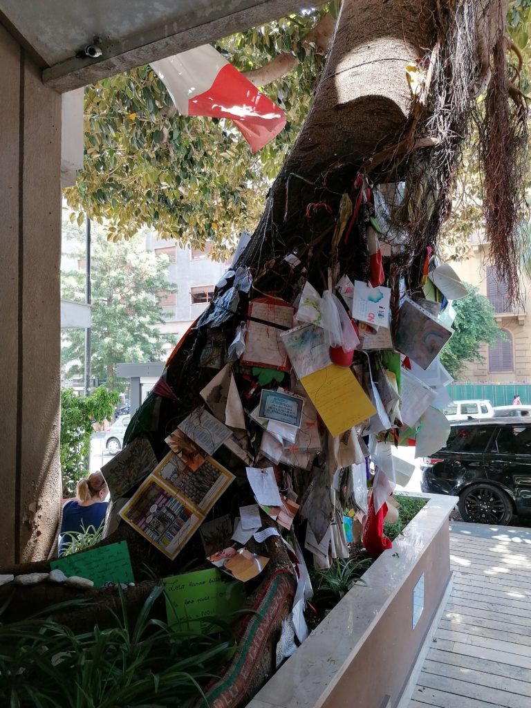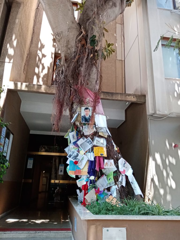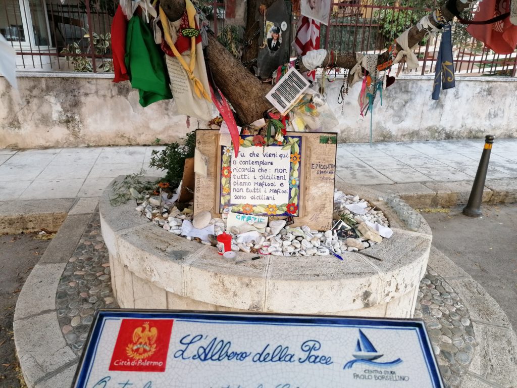 L’altro albero della memoria è in via D’Amelio, dove il 19 luglio del 1992, a quasi due mesi dalla strage di Capaci, venne ucciso il magistrato Paolo Borsellino, amico fraterno di Falcone. Una Fiat 126 rubata contenente circa 90 chilogrammi di esplosivo, telecomandati a distanza, esplose sotto il palazzo dove all’epoca abitavano Maria Pia Lepanto e Rita Borsellino (rispettivamente madre e sorella del magistrato); il giudice quella domenica era andato a fare visita alla famiglia. Oltre a Borsellino, persero la vita i cinque agenti della scorta Agostino Catalano, Emanuela Loi (prima donna a far parte di una scorta e anche prima donna della polizia di Stato a cadere in servizio), Vincenzo Li Muli, Walter Eddie Cosina e Claudio Traina. L’unico sopravvissuto fu l’agente Antonino Vullo, risvegliatosi in ospedale dopo l’esplosione, in gravi condizioni.