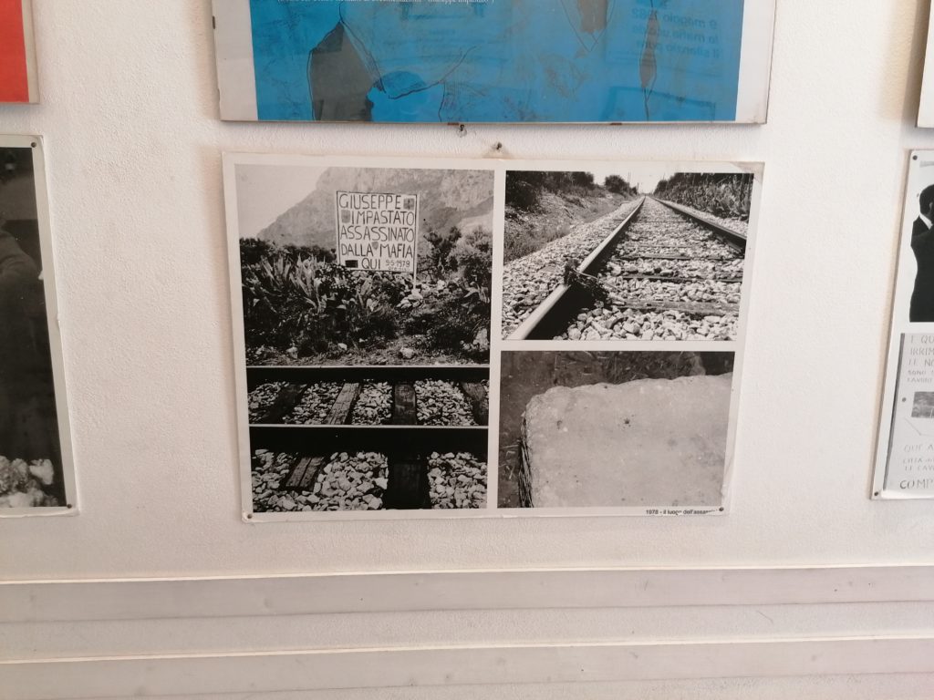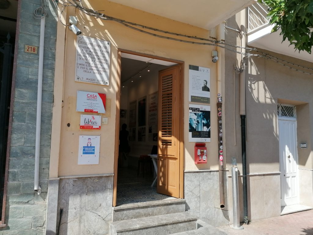 Da Terrasini a Cinisi bisogna attraversare poco più di quattro chilometri di asfalto bollente per arrivare alla casa natale di Peppino Impastato. La città è deserta, complice il periodo estivo; i residenti sono tutti in spiaggia e le visite al museo dedicato al giornalista sono contingentate, a causa del Covid-19. Alcune piastrelle in ceramica, con scritte antimafia, ricostruiscono il famoso percorso dei cento passi, che dividono l’abitazione di Impastato da quella del boss Tano Badalamenti. Percorrendo il tragitto vengono in mente le scene del film di Marco Tullio Giordana, dove un bravissimo Luigi Lo Cascio interpreta magistralmente il giornalista assassinato dalla mafia. All’ingresso della casa manifesti e foto tappezzano i muri, ripercorrendo la vita di Peppino. Insieme a una ragazza di un’associazione di volontariato, che accoglie le scolaresche in visita, c’è Giovanni Impastato, il fratello di Peppino. Non è di buon umore, preoccupato per l’avanzare del Coronavirus in terra siciliana degli ultimi giorni, teme ripercussioni sul regolare afflusso dei visitatori. Si congeda velocemente, una serie di incombenze lo attende, lasciandoci in compagnia della volontaria.
