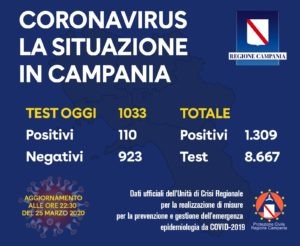 Il nuovo bollettino giornaliero dell’unità di crisi della Regione Campania ha reso noto che sono pervenuti i dati dei tamponi esaminati nei diversi ospedali regionali preposti ai test. Su 1033 verifiche sono risultate positive 110 persone. Il numero dei contagiati in tutta la regione sale a 1309.