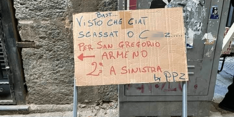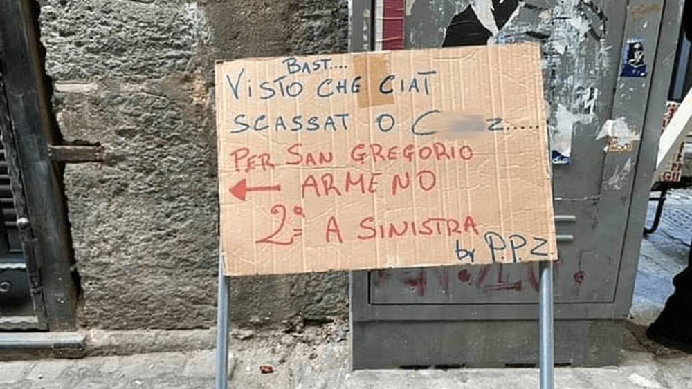 Non fa eccezione la singolare vicenda del cartello affisso a Napoli, in prossimità di San Gregorio Armeno, da alcuni residenti della zona i quali, stufi delle continue richieste di indicazioni dei turisti per la strada delle storiche botteghe di arte presepiale, hanno pensato di fornire in tale maniera ai visitatori le indicazioni per raggiungere il celebre vicolo, il tutto in un linguaggio che si potrebbe definire, eufemisticamente, colorito. Le reazioni dell’opinione pubblica, come spesso accade, sono state le più disparate ma i più, comprese le autorità, hanno bollato il gesto come “anti-turistico”, condannandone il linguaggio scurrile e la mancanza di garbo che, in una città che si vorrebbe definire campionessa di accoglienza, non dovrebbe mai mancare.