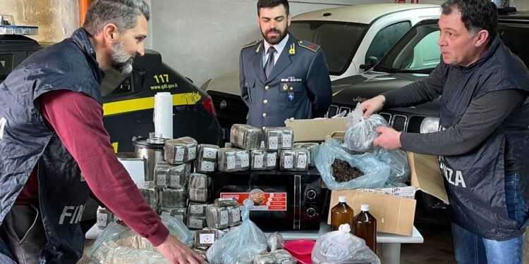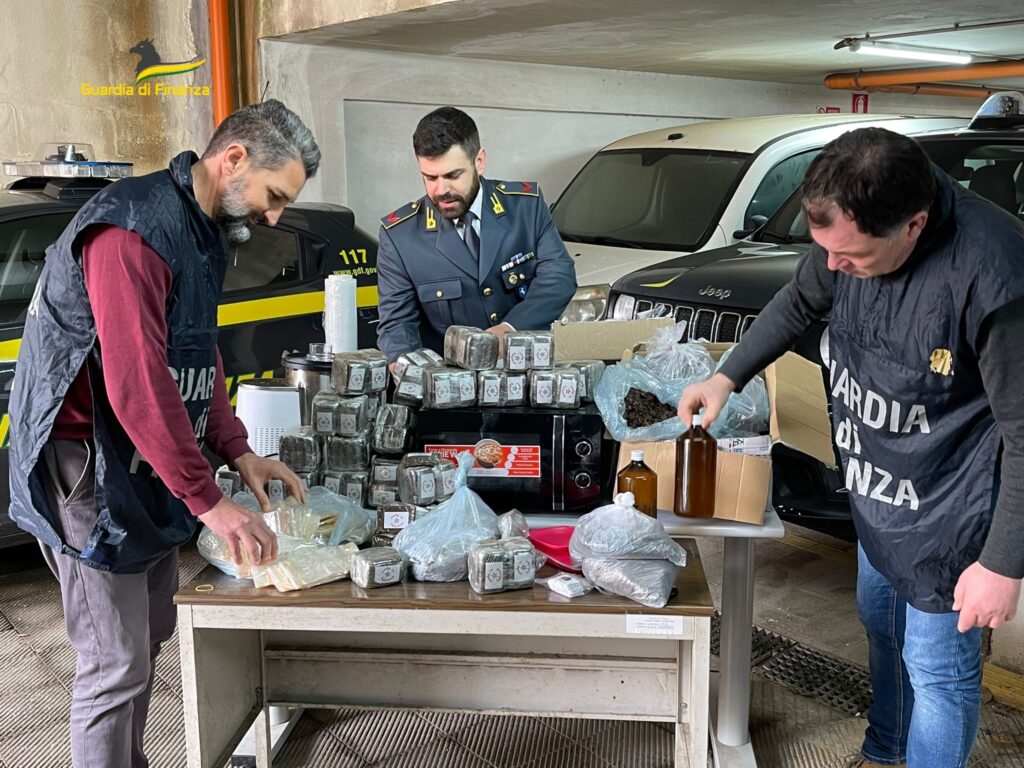 L’attività è stata eseguita dai Finanzieri della Compagnia di Mondragone i quali, dopo un’articolata attività info-investigativa svolta grazie alla costante presenza sul territorio, hanno individuato un immobile sito nel comune di Castel Volturno adibito a vera e propria raffineria di stupefacenti. Infatti, le conseguenti attività di perquisizione svolte hanno permesso di riscontrare la presenza di tre uomini, un italiano residente nel a Pozzuoli e due cittadini extracomunitari provenienti dal Marocco, intenti nella preparazione di dosi di stupefacente pronte per essere cedute sul mercato illegale, nonché di rinvenire 77 kg di hashish sfuso e già lavorato, unitamente a materiale per il confezionamento, tra cui un bilancino di precisione, un forno a microonde, un frullatore, una confezione di olio e circa 2.000 bustine di cellophane.