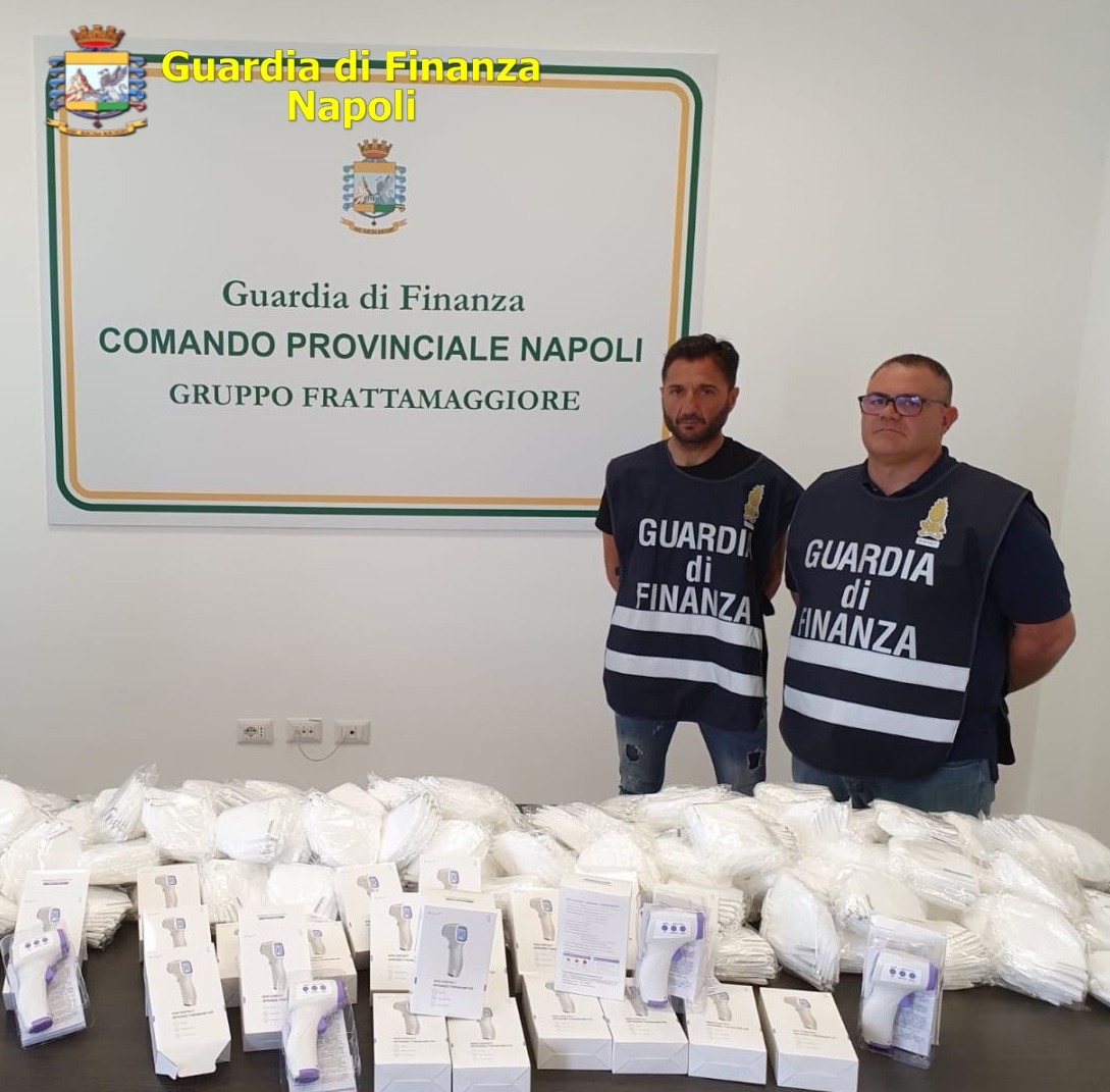 In particolare, la prima delle due operazioni è stata sviluppata sulla falsariga dell’analisi di rischio condotta dal gruppo di Frattamaggiore sulle spedizioni provenienti dalla Cina e destinate in massima parte a esercizi commerciali gestiti da cittadini cinesi operanti nel Napoletano. Sono state sequestrate ben 25.600 mascherine spacciate fraudolentemente per Kn95, prive di qualsiasi documentazione attestante le caratteristiche protettive e delle autorizzazioni e certificazioni per l’importazione. I dispositivi erano confezionati in involucri trasparenti da circa 50 pezzi ciascuno, mentre in un’altra confezione sono state ritrovate circa 10.000 etichette con indicazioni sul prodotto in sola lingua cinese. Nella spedizione erano inclusi 65 termometri a infrarossi con il marchio Ce contraffatto, anch’essi privi di indicazioni per il consumatore in lingua italiana. Denunciato all’autorità giudiziaria il responsabile, un trentenne di origine cinese, titolare di un’attività di commercio al dettaglio di articoli per uso domestico, per frode in commercio e contraffazione.