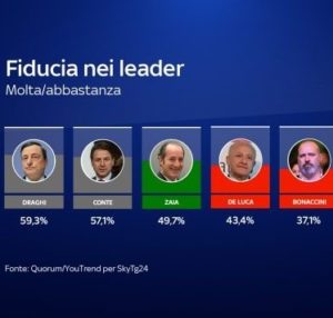 Un altro dato eclatante emerso dal sondaggio è quello che riguarda i leader politici capaci di ispirare maggiore fiducia negli italiani in questo periodo così complicato, col presidente della Regione Campania, Vincenzo De Luca, in grado di piazzarsi al primo posto tra quelli del Centrosinistra, forte di un gradimento superiore al 43%. In vetta a questa particolare graduatoria, peraltro, spiccano due nomi non legati formalmente ad alcun partito politico (altra indicazione interessante): l’economista Mario Draghi, ex presidente della Banca Centrale Europea, col 59,3% e l’attuale premier Giuseppe Conte col 57,1%. Dietro di loro, sfilano uno dopo l’altro tre presidenti di Regione: Luca Zaia del Veneto (49,7%), il campano De Luca (43,4%) e Stefano Bonaccini dell’Emilia Romagna (37,1%). Soltanto dopo, quindi, c’è spazio per leader nazionali come Meloni (33,2%), Salvini (31,2%), Nicola Zingaretti (30,4%) e via via tutti gli altri.