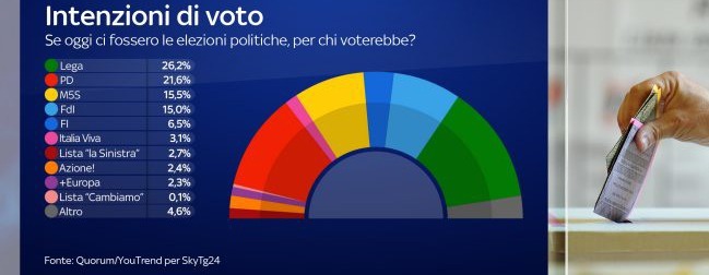 La Lega di Matteo Salvini ancora primo partito d’Italia, seppure in leggero calo, con più di un quarto dei votanti (26,2%); il Partito Democratico secondo, oltre il 21%; Movimento 5 Stelle e, clamorosamente, Fratelli d’Italia di Giorgia Meloni che duellano intorno al 15%; un’eventuale “Lista Conte” capace di issarsi subito al quarto posto, con un dato superiore al 14%: sono questi i numeri principali sulle intenzioni di voto degli italiani nel periodo immediatamente successivo alla fase più acuta dell’emergenza Coronavirus in Italia, diffusi oggi da Sky Tg24, che ha aperto l’edizione mattutina del suo notiziario proprio con questo sondaggio commissionato alla società Quorum/YouTrend.