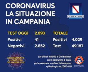 In serata sono arrivati, come ogni giorno, i numeri relativi ai nuovi tamponi positivi in Campania e a quelli effettuati in totale in giornata sul territorio regionale, comunicati dall’Unità di crisi della Regione e resi noti, come di consueto, dallo stesso De Luca sulla sua pagina Facebook. Ecco, dunque, i dati odierni: all’ospedale Cotugno di Napoli sono stati esaminati 806 nuovi tamponi dei quali 22 risultati positivi; al Ruggi di Salerno esaminati 821 tamponi di cui 4 positivi; all’ospedale Sant’Anna di Caserta sono stati esaminati 157 tamponi, nessuno dei quali positivo; all’Asl di Caserta presidi di Aversa-Marcianise: sono stati esaminati 124 tamponi di cui 3 positivi; all’ospedale Moscati di Avellino sono stati esaminati 149 tamponi di cui nessun positivo; all’ospedale San Paolo di Napoli sono stati esaminati 79 tamponi di cui 2 positivi; all’Azienda Universitaria Federico II esaminati 67 nuovi tamponi di cui 0 positivi; all’Istituto Zooprofilattico Sperimentale del Mezzogiorno 517 tamponi di cui 8 positivi; all’ospedale di Nola sono stati esaminati 64 tamponi di cui 1 positivo; all’ospedale San Pio di Benevento sono stati esaminati 79 tamponi, 0 positivi; all’ospedale di Eboli sono stati esaminati 35 tamponi di cui 1 positivi. I numeri dei positivi giunti in serata sono 41 su 2.893 tamponi esaminati. Il totale complessivo dei positivi in Campania comunicato dall’Unità di crisi finora è di 4.029 su un totale complessivo di tamponi pari a 49.187.