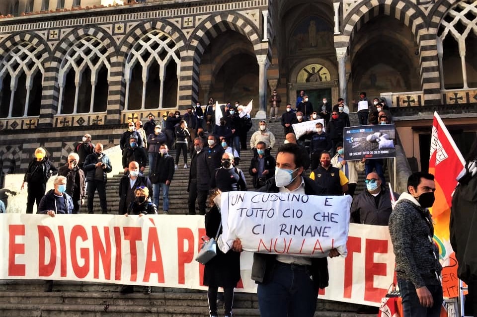 I lavoratori del comparto turistico hanno protestato anche in piazza Duomo ad Amalfi. Tra i manifestanti figuravano soprattutto i gestori dei numerosissimi bed & breakfast presenti in città, i quali sono scesi in piazza imbracciando dei cuscini come gesto simbolico per denunciare il fatto che è stato un anno nero per le strutture ricettive, rimaste letteralmente vuote senza garanzie di guadagno né per i gestori né per i lavoratori. Sulla scalinata della cattedrale hanno manifestato anche i tour operator e i lavoratori delle agenzie di viaggio della Costiera Amalfitana. Gli operatori turistici scesi in piazza hanno chiesto anche loro interventi mirati da parte del Governo per risollevare le sorti dell’intero settore, tra questi maggiore chiarezza sul passaporto sanitario, una campagna vaccinale per il comparto turistico, la detassazione fiscale delle loro attività e l’estensione del superbonus per il recupero del patrimonio immobiliare privato.