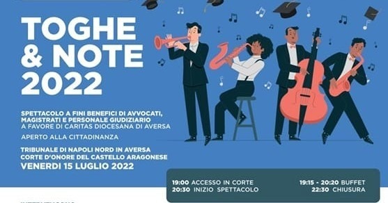Dopo il successo delle prime tre edizioni (tenutesi nel 2016, 2017 e 2020), anche quest’anno, venerdì 15 luglio 2022, alle 20:30 (ingresso a partire dalle 19:00), si terrà la quarta edizione di Toghe & Note, nel corso della quale si esibiscono magistrati, avvocati, personale di cancelleria e operatori del mondo giudiziario, spogliandosi delle toghe e dei loro abiti da lavoro, per una buona “causa”, la solidarietà ed il sostegno a favore di chi aiuta i più deboli dimostrando insoliti e nascosti talenti artistici.