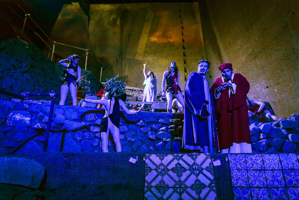 L’Inferno è uno spettacolo-evento che, da ben 15 anni, diffonde la figura e l’opera del sommo poeta, sfruttando il suggestivo scenario delle grotte: non ci sono quinte o fondali di cartapesta, ma uno straordinario scenario preistorico, che si fonde con giochi di luce, suoni e installazioni d’arte contemporanea. Una rappresentazione unica nel suo genere, che si snoda per circa un chilometro tra imponenti gruppi stalatto-stalagmitici e straordinarie morfologie di concrezionamento, coinvolgendo circa trenta artisti, tra attori, cantanti e ballerini. Nel mezzo del cammin di nostra vita, lo spettatore incontra i diversi personaggi che popolano la prima cantica dantesca: da Virgilio a Francesca da Rimini, dalle Fiere a Farinata degli Uberti, da Beatrice alle Erinni, Pier delle Vigne, Ulisse e il Conte Ugolino. Il pubblico, diviso in gruppi, diviene protagonista di un viaggio sbalorditivo, guidato da un attore che interpreta Dante Alighieri, con il quale percorre i nove cerchi degli inferi, così come immaginati dal poeta. Quid pluris del tragitto, una struggente colonna sonora composta da Enzo Gragnaniello e la visione di diverse video installazioni, ritraenti le anime dannate.
