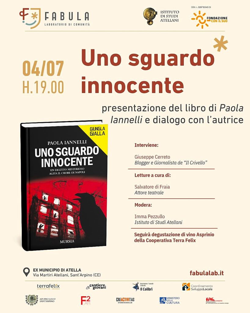 La giornalista e scrittrice partenopea Paola Iannelli arriva a Sant’Arpino, in provincia di Caserta, per presentare il suo ultimo lavoro editoriale di successo, il pluripremiato romanzo gialloUno sguardo innocente, pubblicato dalla casa editrice Mursia. Si tratta del terzo capitolo dell’intrigante e avvincente saga noir poliziesca con protagonista Titta Longano, coraggiosa brigadiera dell’Arma determinata a scoprire la verità su alcuni dei più misteriosi delitti commessi all’ombra del Vesuvio.