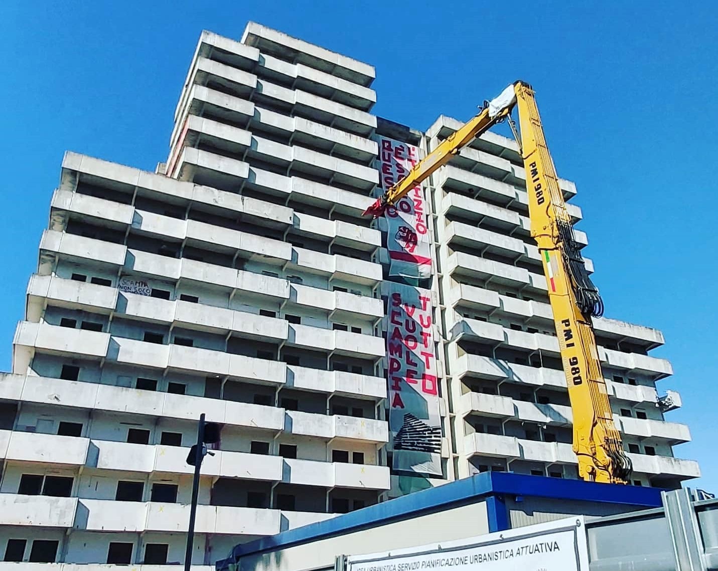 Hanno finalmente avuto inizio, verso le ore 11,30 di questa mattina, i lavori per la demolizione della Vela Verde di Scampia, uno dei quattro edifici superstiti del complesso di edilizia popolare tristemente assurto, nel tempo, a simbolo del degrado di un’intera comunità urbana. L’abbattimento, la cui data precisa era stata annunciata una settimana fa, sta avendo luogo in maniera ordinata, senza l’impiego di cariche esplosive: sul posto sono intervenuti diversi escavatori, tra cui un cingolato da 130 tonnellate che, con l’ausilio di una grossa pinza oleodinamica capace di spingersi ad oltre 52 metri di altezza, dovrebbe portare a compimento il lavoro in un arco di tempo di circa quaranta giorni.