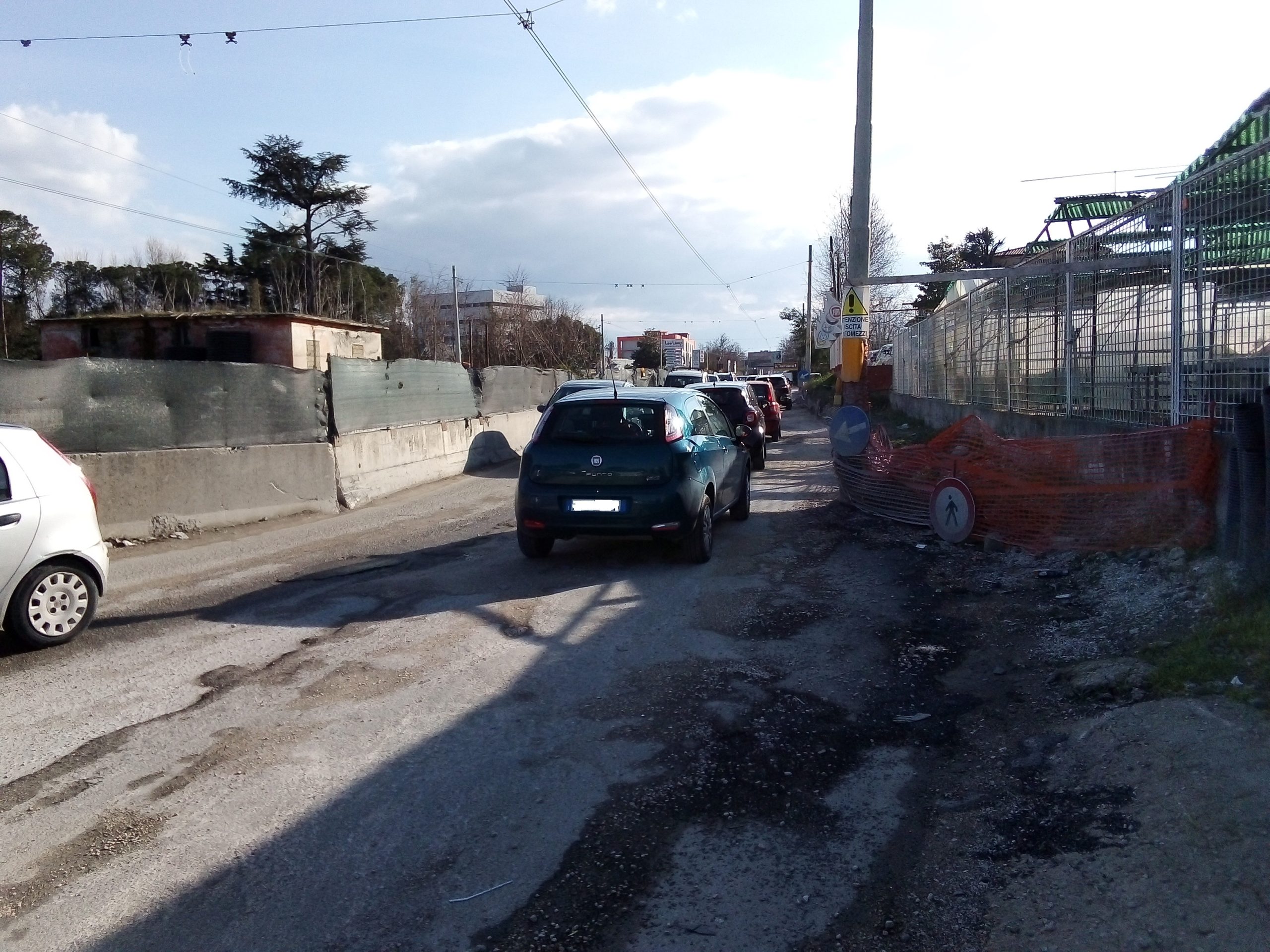 È da mesi, ormai, che il cantiere non va oltre, con gravi disagi per gli automobilisti, per chi lavora e per chi abita nei paraggi. All’altezza di una pescheria la strada improvvisamente si stringe e sposta leggermente il suo percorso lineare, permettendo a stento l’incrocio di due autovetture. Se transitano anche mezzi pesanti è la fine. La conseguenza sono code che diventano lunghissime nelle ore di punta, con ricadute anche sul già citato svincolo dell’asse mediano.