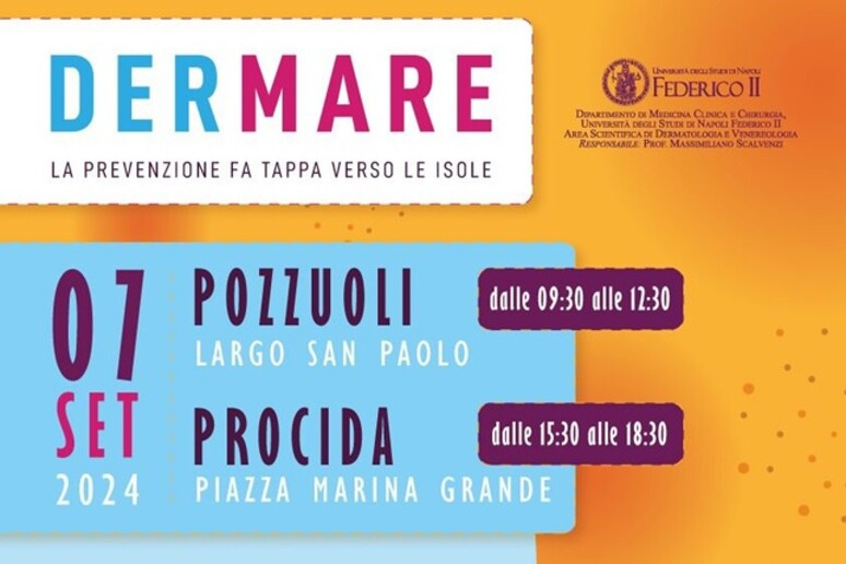 Sabato 7 settembre, un team di dermatologi esperti sarà presente in due diverse località. La mattina, dalle 9:30 alle 12:30, il team opererà a Pozzuoli, in Largo San Paolo, dove sarà allestito un truck per le visite. Nel pomeriggio, i medici si sposteranno a Procida a bordo del catamarano Dermare, proseguendo l’iniziativa presso Piazza Marina Grande dalle 15:30 alle 18:30.